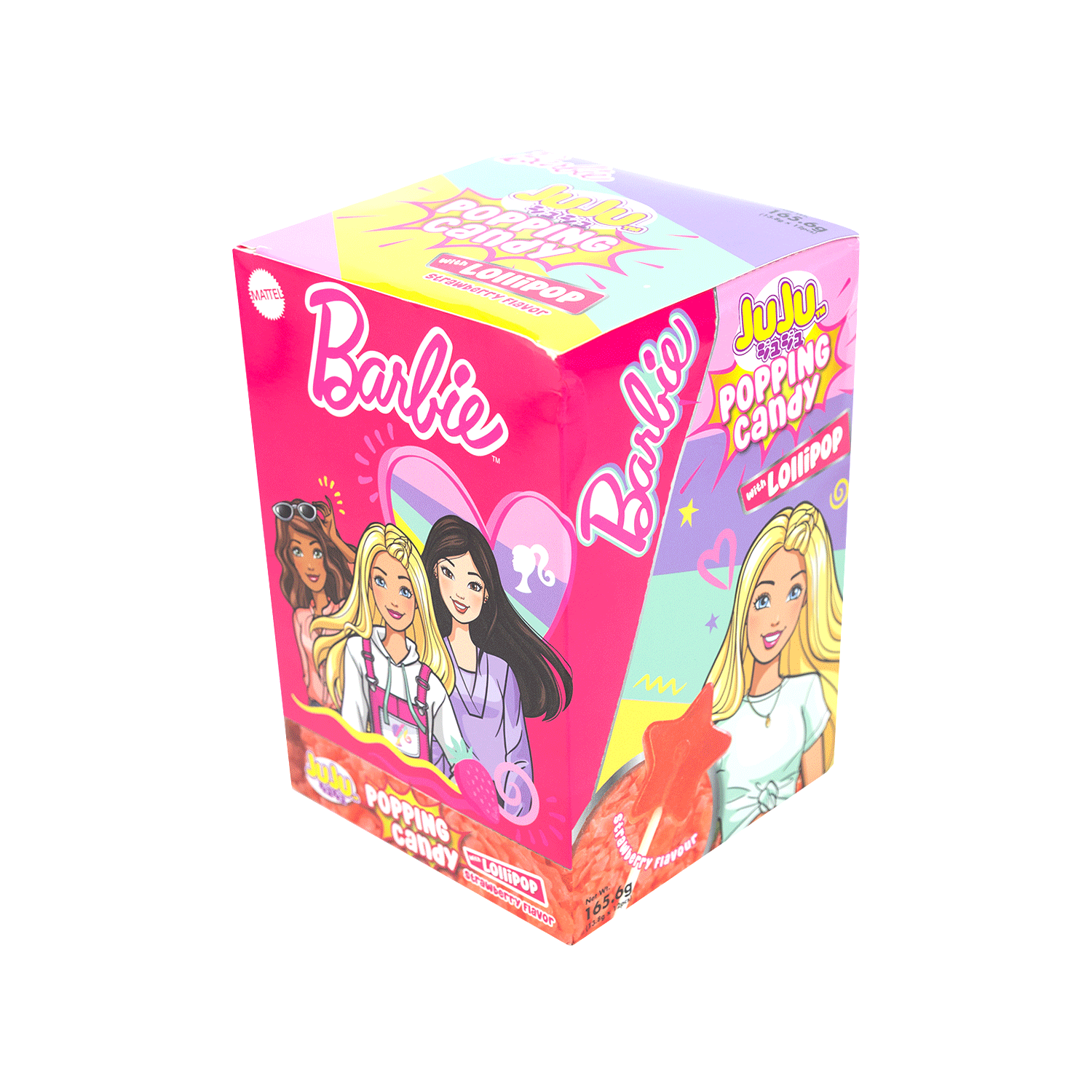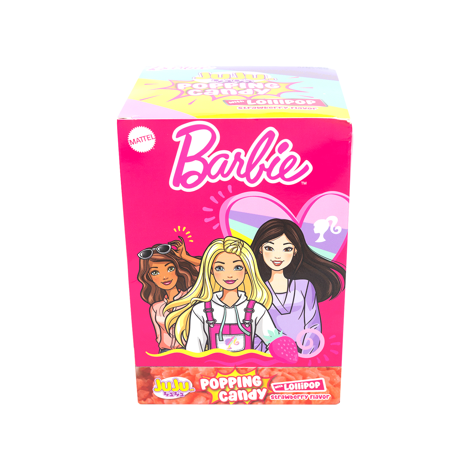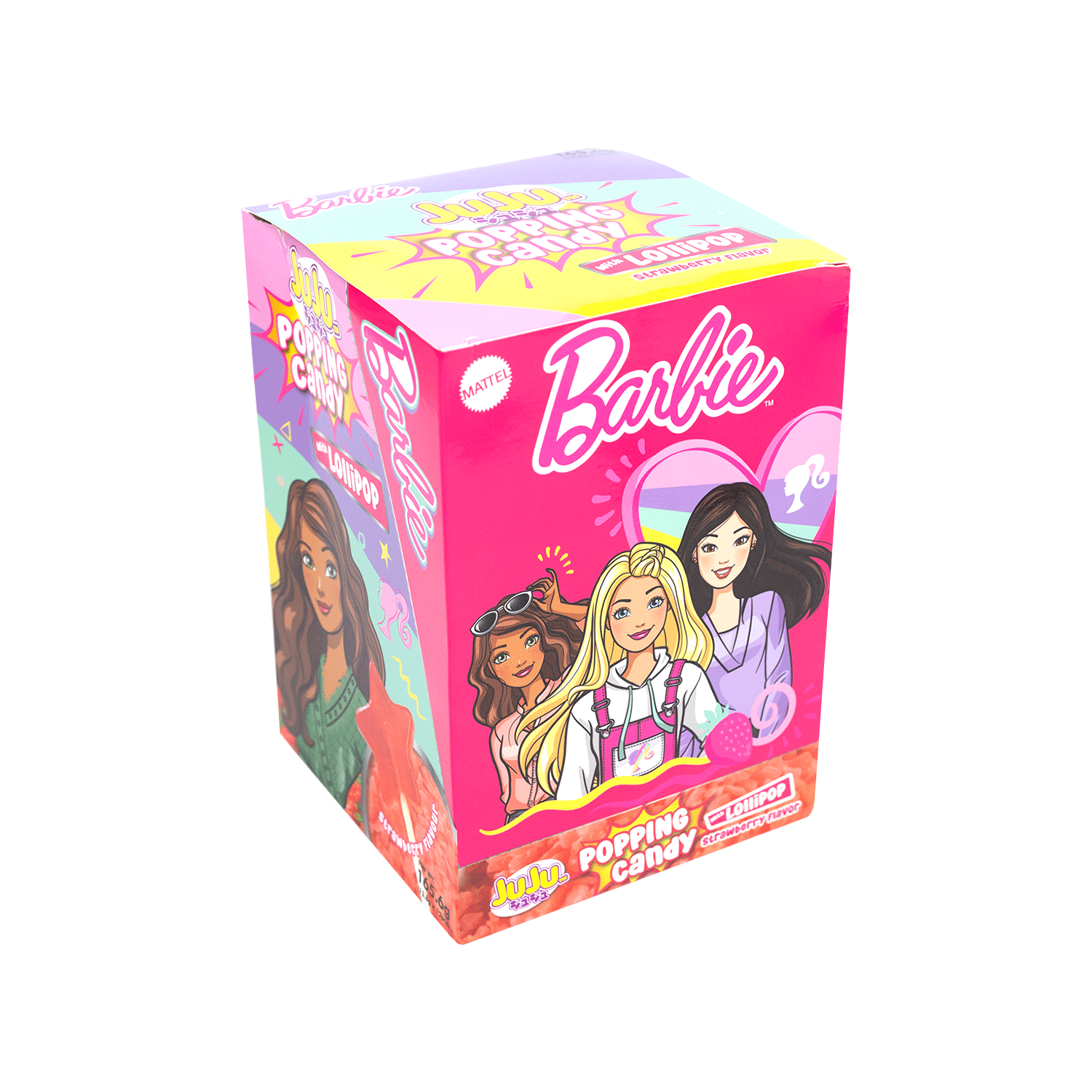 Each tray contains 12 packs of Juju Barbie Popping Candy Strawberry with Lollipop 13.8g.